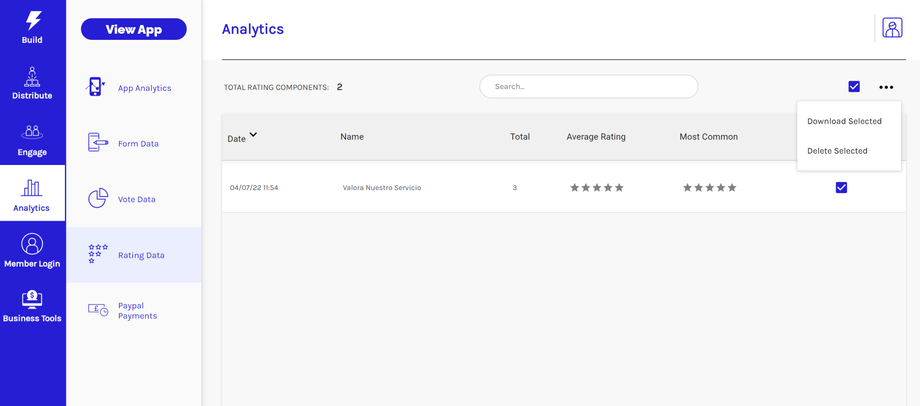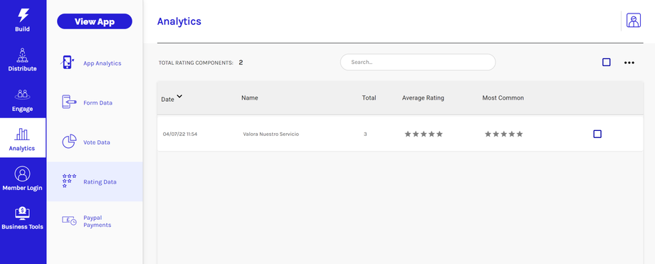 Verás todas las calificaciones y comentarios capturados de los usuarios de tu aplicación a través del Componente de calificación dentro de tu aplicación.