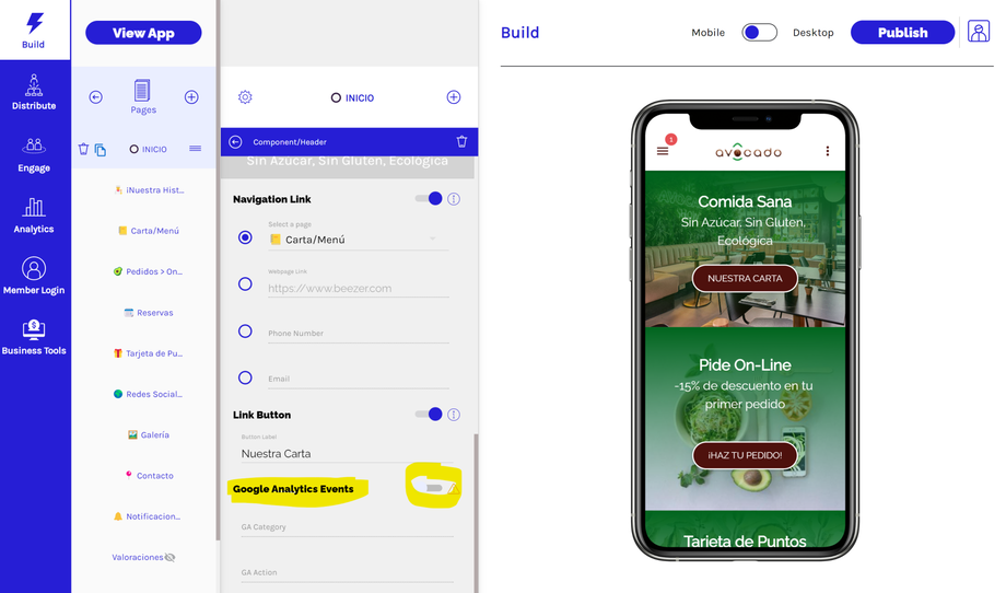 Paso 3: para realizar un seguimiento de Analytics de un componente, debes activar Google Analytics en el componente. Para activarlo, navega a cualquiera de los componentes y en la parte inferior encontrarás la sección Eventos de Google Analytics. Para activarlo, utiliza el botón de alternar