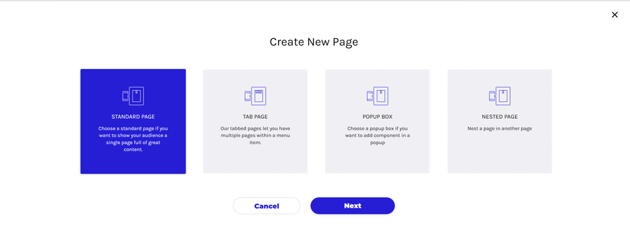Una página puede ser una página estándar/ESTANDAR PAGE, con pestañas/TAB PAGE, de cuadro emergente/POPUP BOX o anidada/NESTED PAGE ; esto se puede cambiar en la 'Configuración de página/Page Settings' del menú desplegable 'Tipo de página/Page Type'.