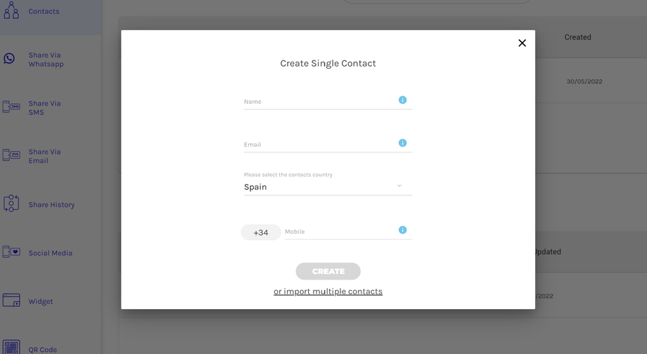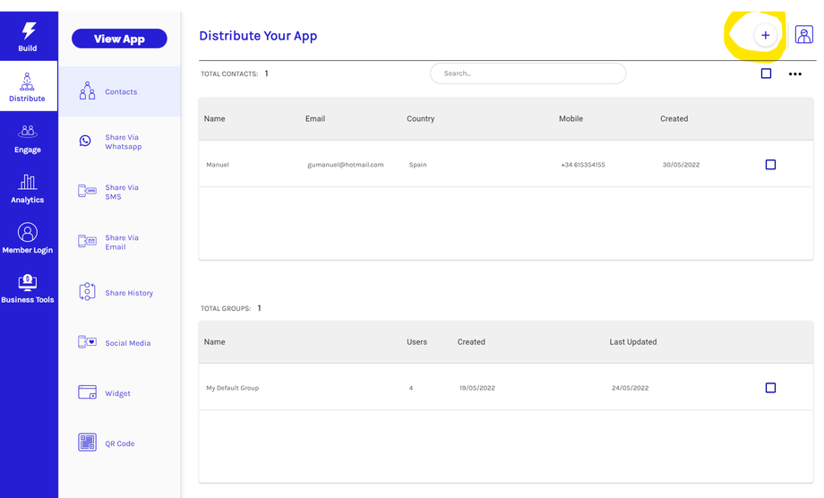 Puedes cargar los contactos uno por uno o cargarlos como una lista usando un archivo CSV. Una vez cargada, puedes compartir tu aplicación a través de correo electrónico y SMS desde la sección Distribuir de su Tablero.