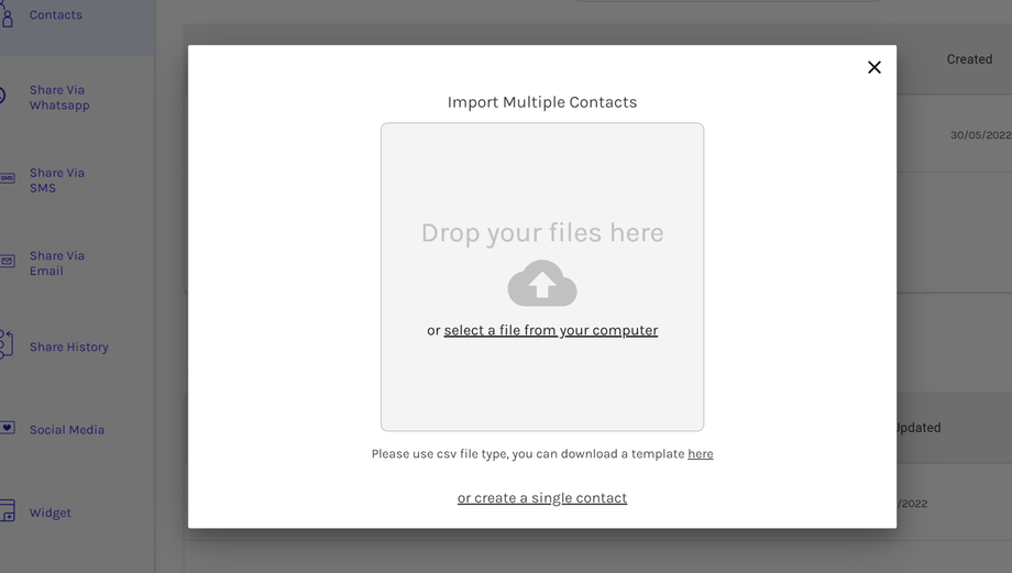Puedes descargar un archivo de plantilla CSV de muestra haciendo clic en el enlace dentro del cuadro emergente. Luego debes crear su archivo CSV basado en esta plantilla.