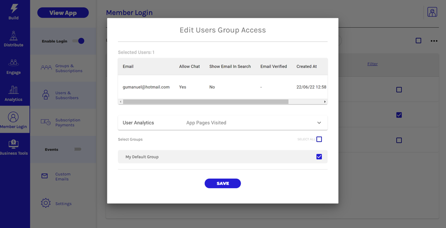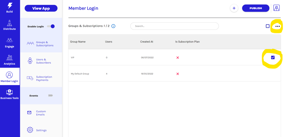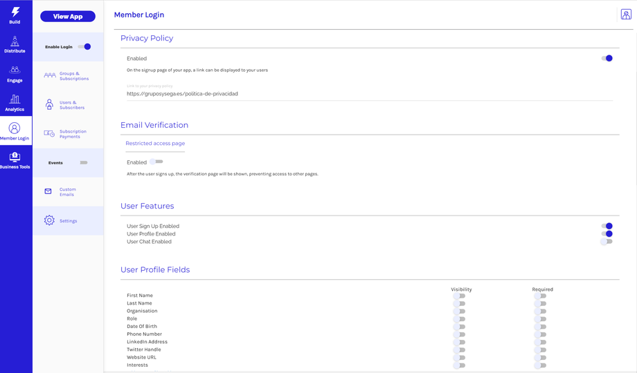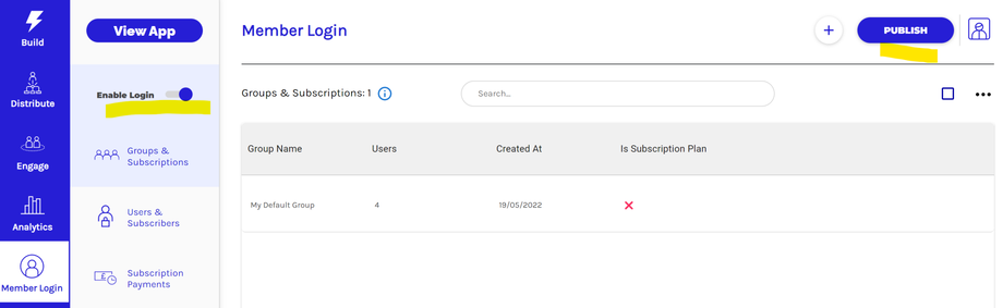Para habilitar el inicio de sesión de miembro* , haz clic en Inicio de sesión de miembro y luego cambia el interruptor 'Habilitar inicio de sesión/Enable Login'. Luego presiona Publicar para actualizar tu aplicación cuando estés listo para permitir el acceso a los usuarios registrados.