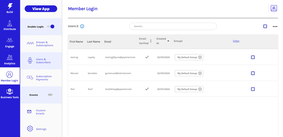 Desde el panel de control, en la sección Inicio de sesión de miembros, puedes ver la lista de usuarios que se han registrado en tu aplicación móvil.