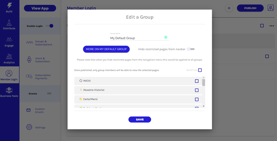 Como creador de la aplicación, puedes especificar a que páginas deseas que tenga acceso cada grupo. Solo los Usuarios de estos Grupos tendrán acceso a las Páginas del Grupo y deberán iniciar sesión en la aplicación si aún no lo han hecho para acceder a la Página.