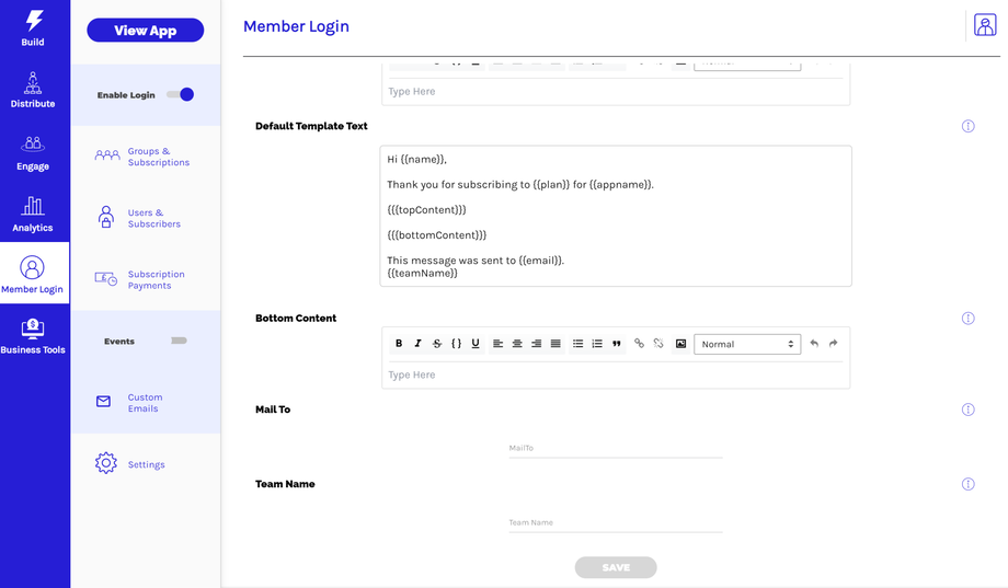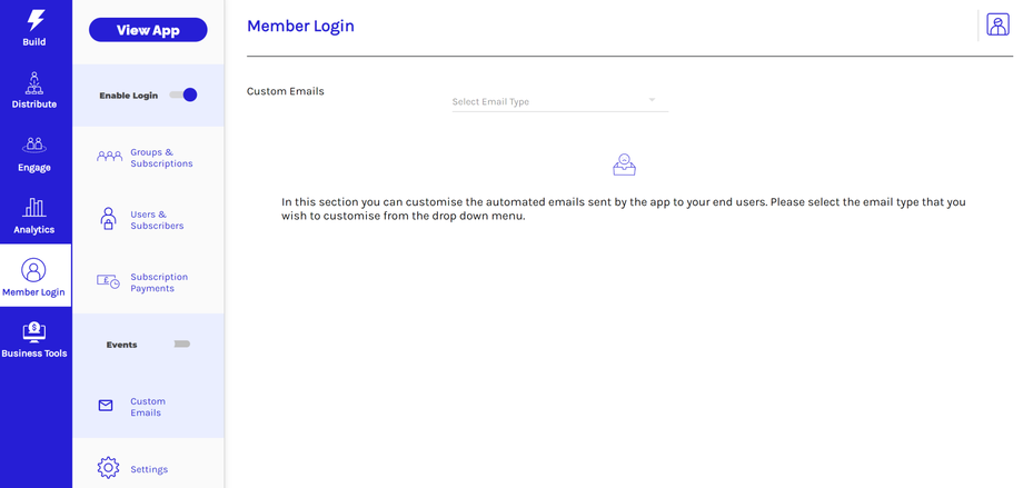 Paso 1. Para personalizar estos correos electrónicos automáticos para tu aplicación, haz clic en la sección de inicio de sesión/Member Login de tu panel.