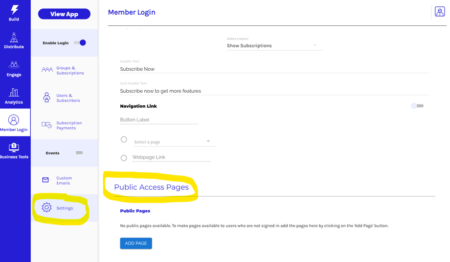 Incluso cuando la función de inicio de sesión de miembros está habilitada, los usuarios de tu aplicación pueden ver las páginas públicas de tu aplicación.