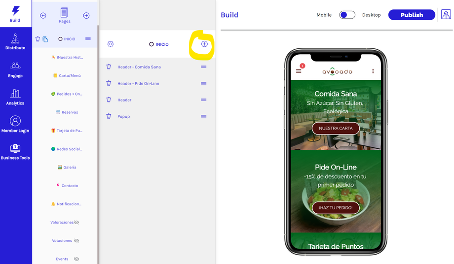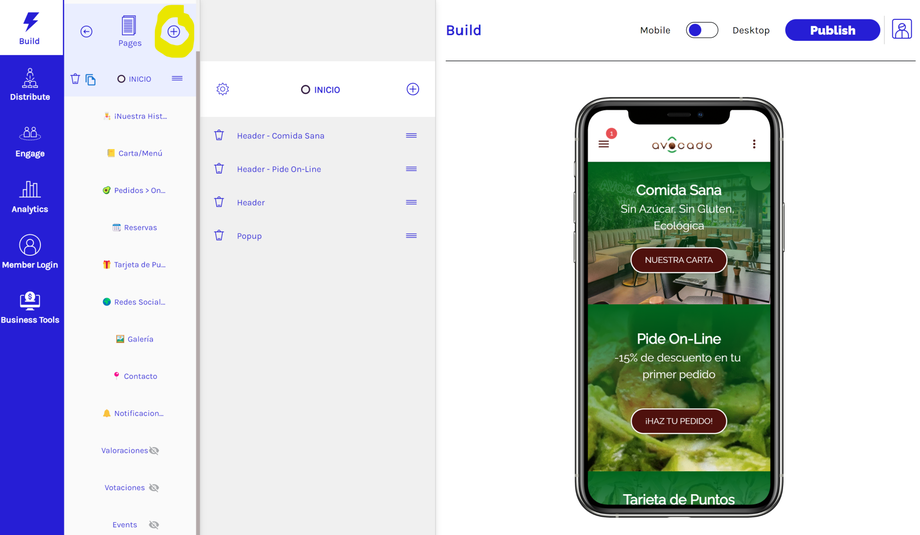 Una vez que hayas agregado o seleccionado la página en la que deseas agregar el componente Encabezado, haz clic en el signo + junto al título de tu página.
