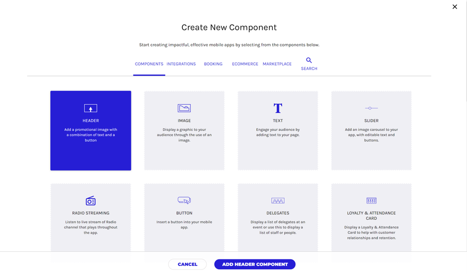 Se te mostrarán todos los componentes existentes disponibles para tu aplicación. Selecciona el componente de encabezado/Header y haz clic en el botón Agregar componente de encabezado en la parte inferior de la página.