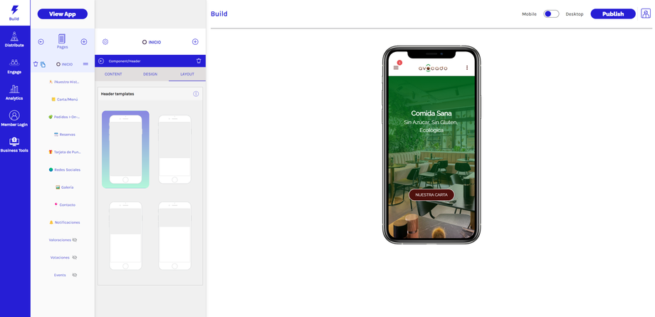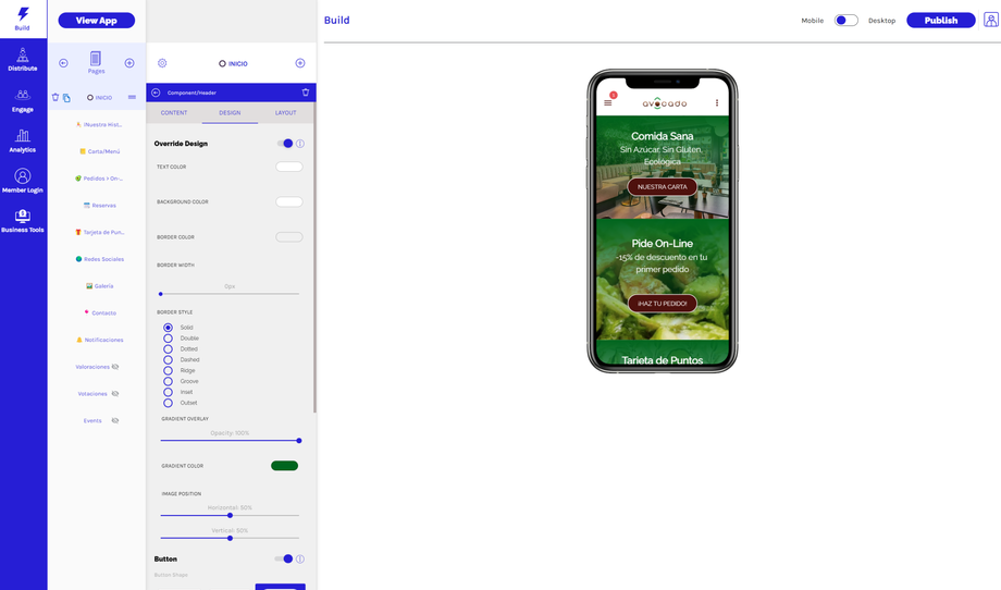 En la pestaña Diseño/Design, puedes anular el diseño general de tu aplicación y personalizar el diseño para tu componente de encabezado.