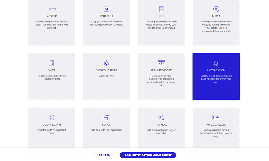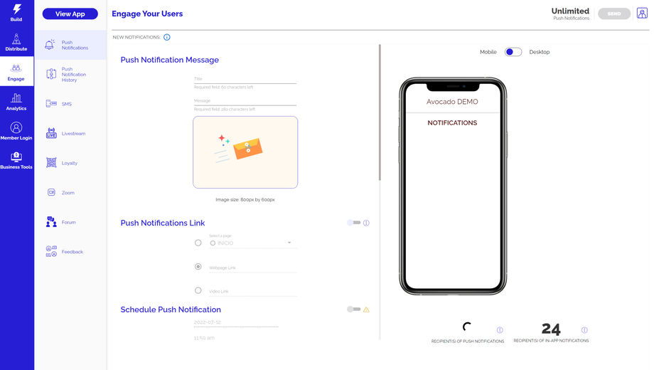 Puedes enviar notificaciones desde la sección ENGAGE de tu panel de control una vez que hayas agregado el componente Notificación a tu aplicación.