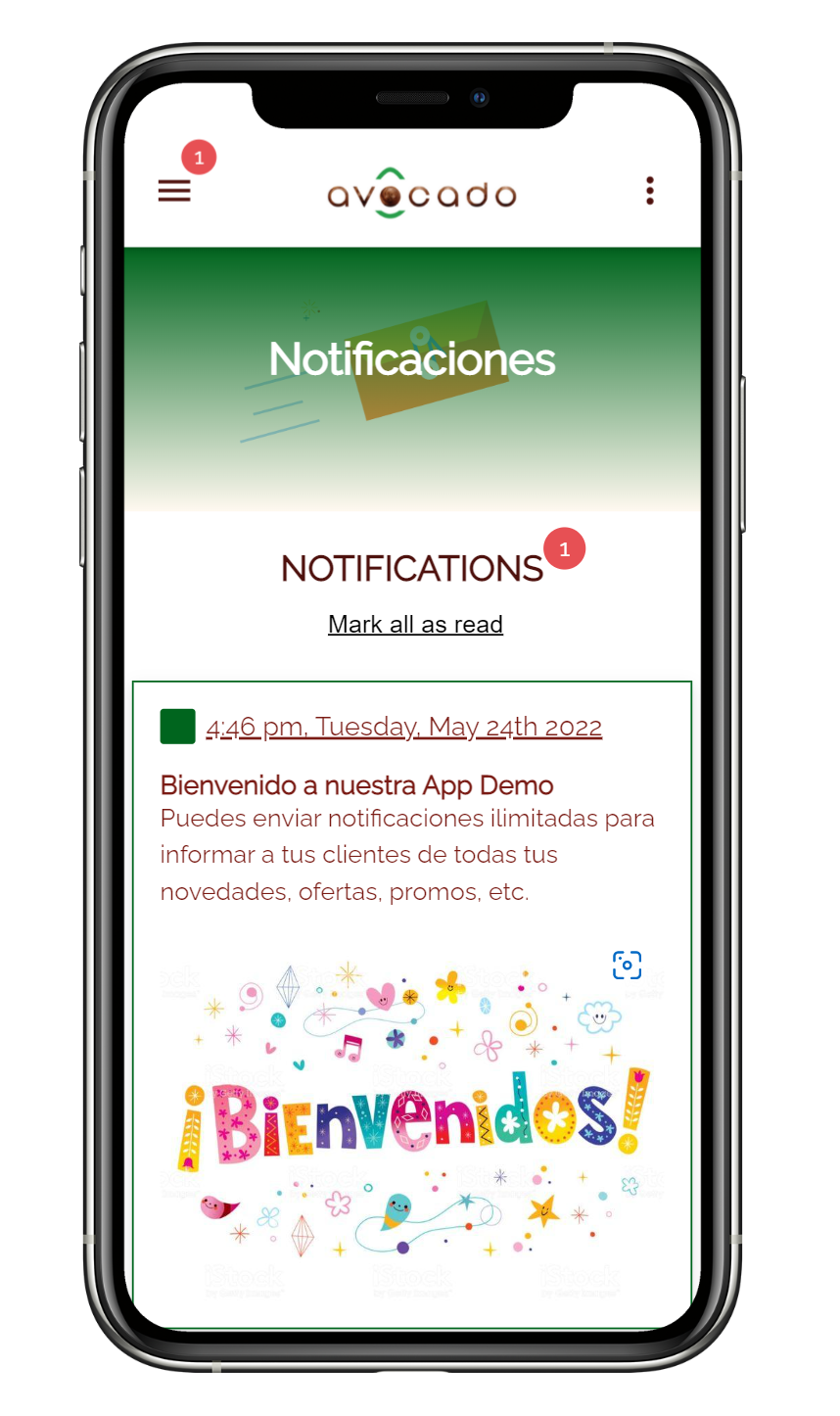 Cuando hayas agregado un componente de notificación y hayas enviado una nueva notificación, tus usuarios verán un punto rojo en el menú de su aplicación para informarles que tienen una nueva notificación para leer. Los usuarios de la aplicación pueden "marcar como leídas" las notificaciones.
