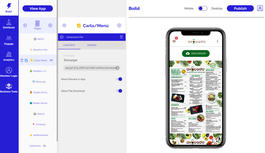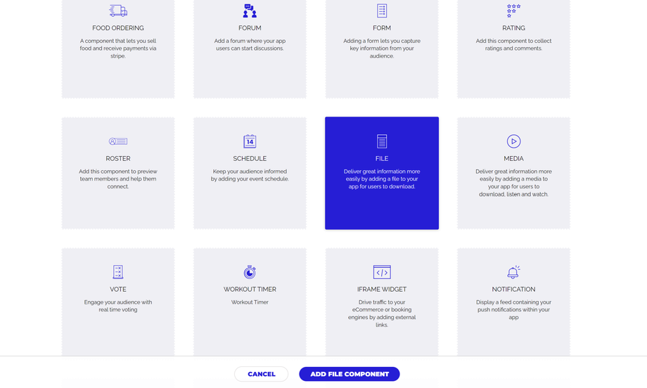 El componente de archivo/file te permite cargar archivos en tu aplicación para que tus usuarios puedan descargarlos en sus dispositivos móviles. Puedes cargar cualquier tipo de archivo, ya sea un archivo PDF, MP3 o Excel (XLS).