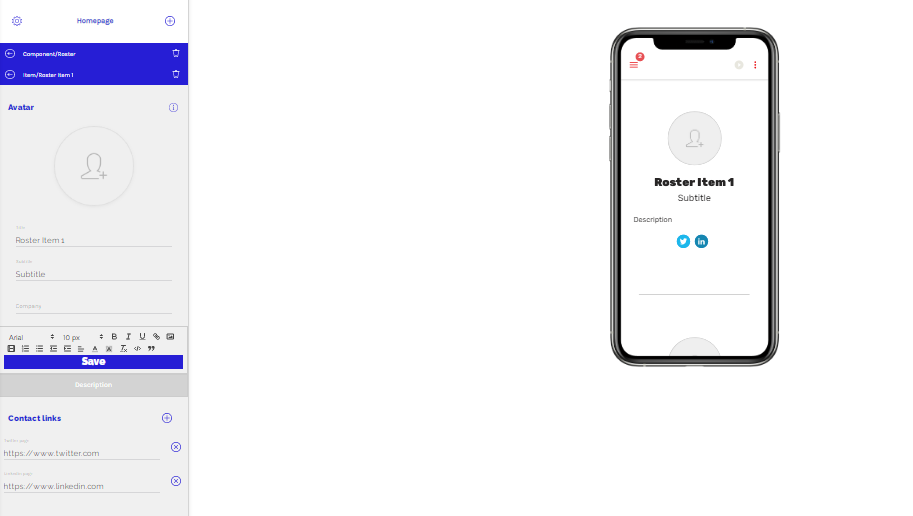 Dentro de cada elemento de la lista, puedes cargar un avatar o una imagen y editar el título, el subtítulo, la empresa y proporcionar una descripción.