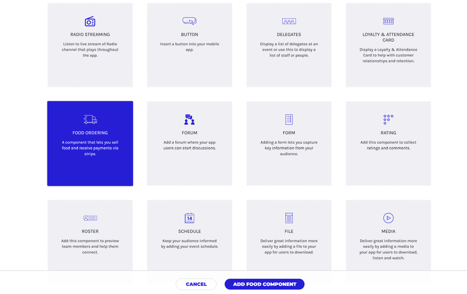 Se te mostrarán todos los componentes existentes disponibles para tu aplicación. Haz clic en el componente de pedidos de comida/Food Ordering, luego haz clic en el botón Agregar componente de comida en la parte inferior de la página.