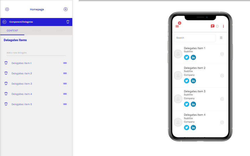 El Componente Delegados te permite listar los Delegados para un evento. Puedes utilizar el componente Delegados para agregar el nombre, el cargo y el nombre de la empresa para los delegados. Los usuarios de tu aplicación pueden incluso buscar delegados utilizando la opción de búsqueda.