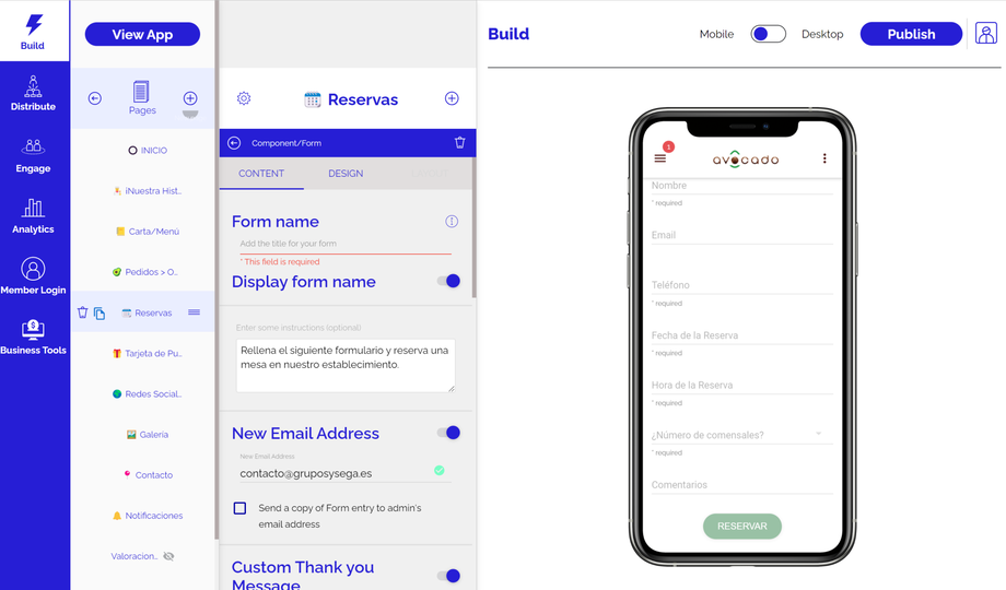 Se puede usar un componente de formulario para capturar datos de los usuarios de tu aplicación. Puedes decidir qué campos deseas mostrar en tu formulario; actualmente permitimos la entrada de texto, una entrada de correo electrónico o una entrada de casilla de verificación. Puedes cambiar el diseño del botón en la pestaña Diseño.
