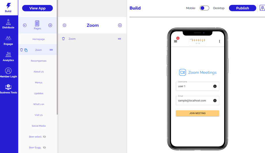 La integración de Zoom te permitirá integrar reuniones en vivo desde la plataforma Zoom en tu aplicación. Para permitir reuniones en vivo usando el componente Zoom a través de tu aplicación, inicia sesión en tu Panel de Control y sigue las instrucciones a continuación: