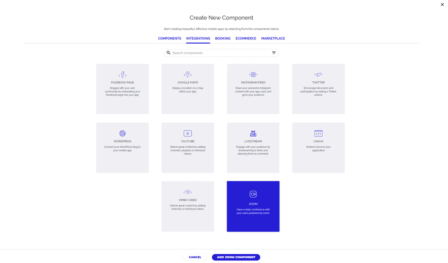 Haz clic en la pestaña Integraciones y selecciona el componente Zoom. Haz clic en el botón Agregar componente Zoom para agregarlo a tu página.
