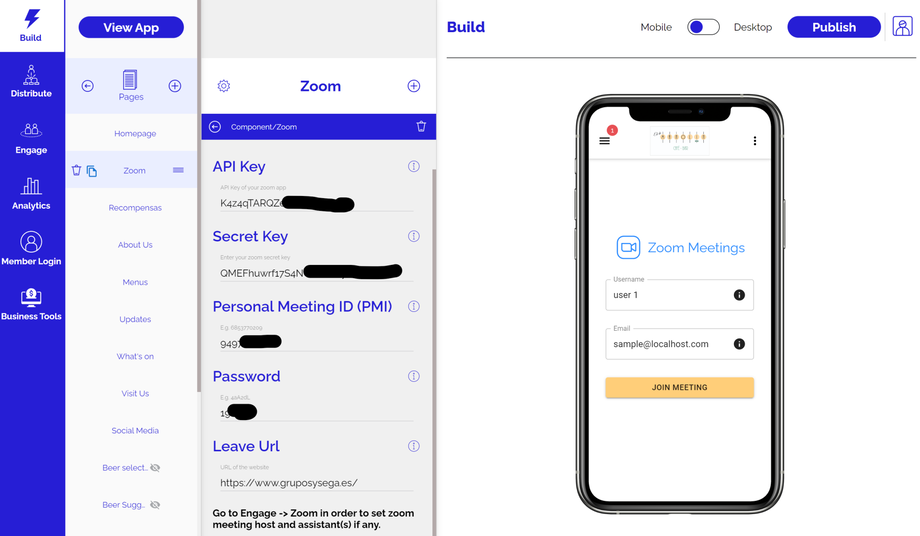 Paso 4: Después de agregar la API y la clave secreta en la pestaña Contenido de tu componente de Zoom dentro del panel de control de tu aplicación, agrega la ID de reunión personal (PMI) y la contraseña de la configuración de tu cuenta de Zoom.