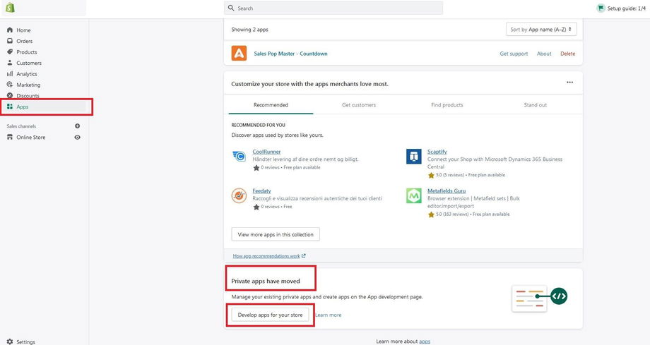 Paso 1: inicia sesión en el panel de administración de tu tienda Shopify y haz clic en Aplicaciones. Una vez dentro de la sección Aplicaciones, haz clic en el botón "Desarrollar aplicaciones para tu tienda".