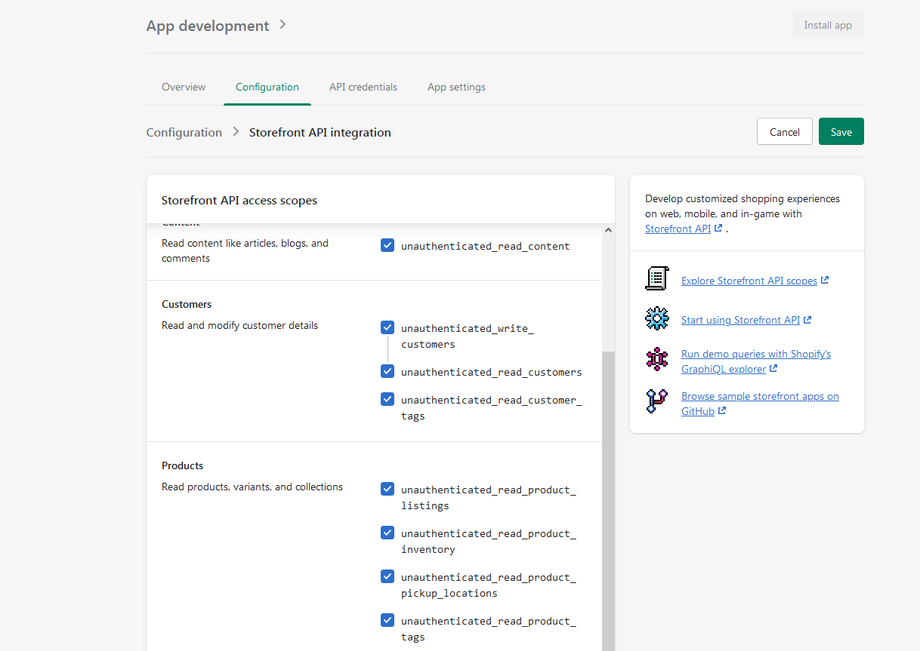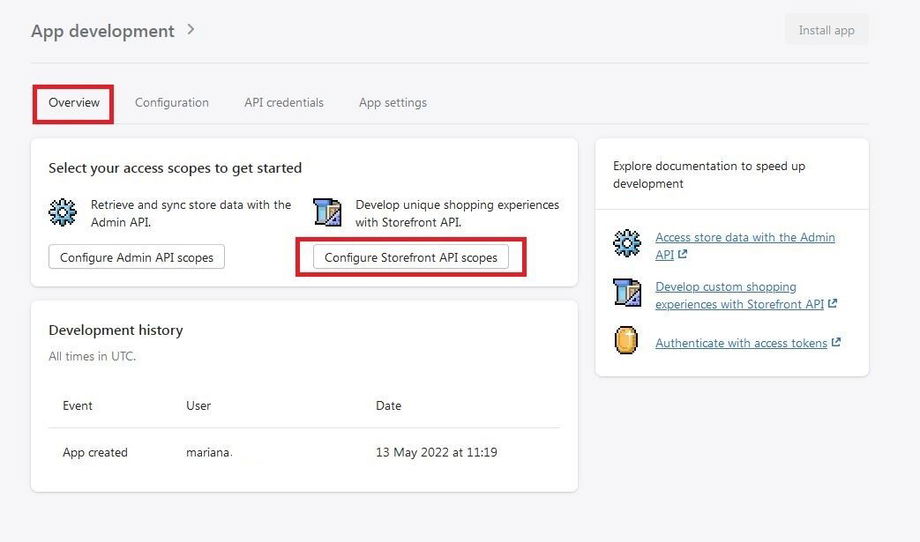 Paso 4: en la pestaña Descripción general, haz clic en el botón Configurar alcances de la API Storefront.