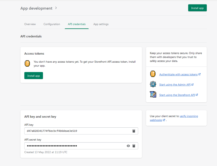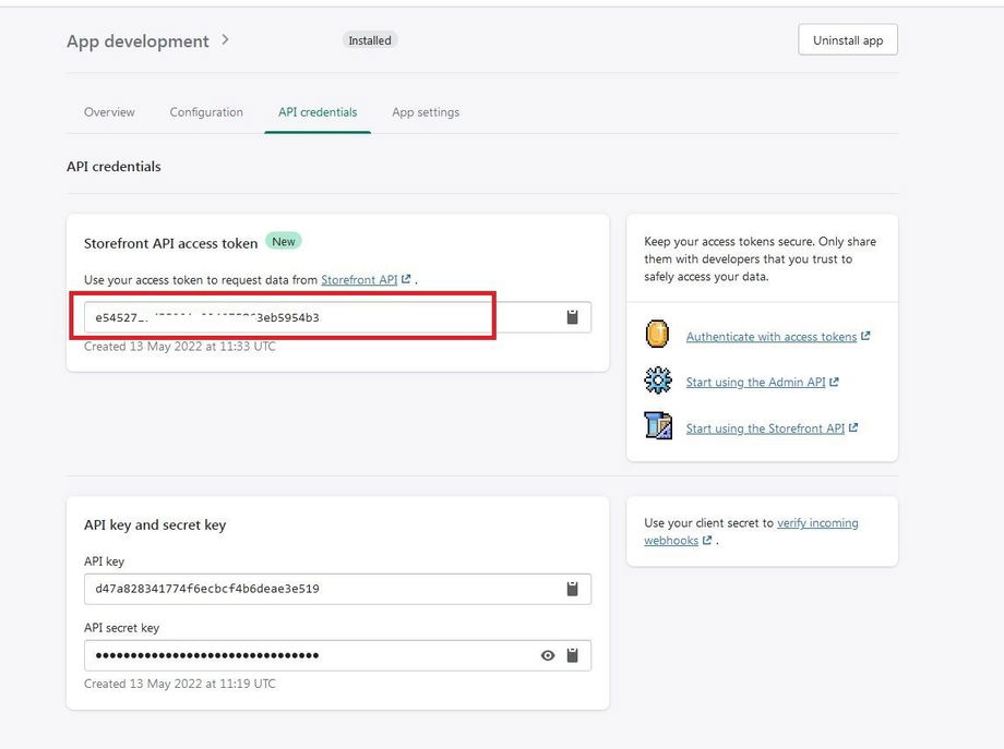Paso 8: Una vez que instales la aplicación, recibirá el token de acceso a la API Storefront, que será necesario para acceder a tu tienda Shopify desde tu aplicación. Copia este código y pégalo en un bloc de notas.