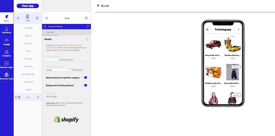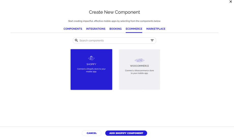 Con el componente Shopify , puedes vincular tu tienda Shopify con tu aplicación y exhibir/vender tus productos usando tu aplicación.
