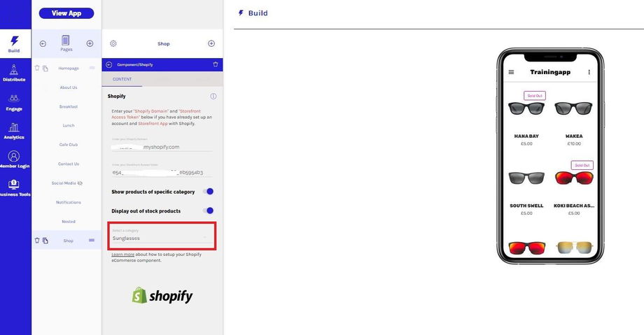 También puedes mostrar productos específicos en tu aplicación seleccionando la categoría de productos desde la configuración del componente Shopify.