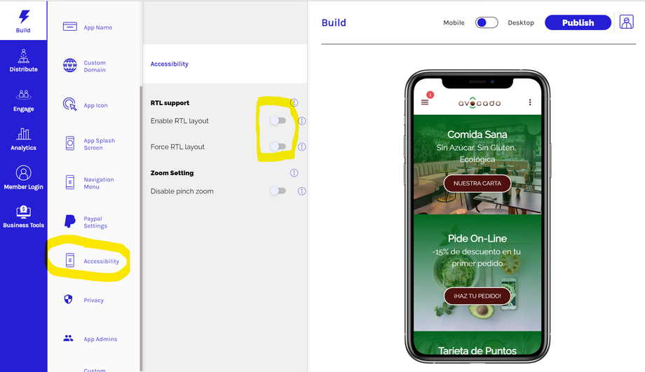 La compatibilidad con el idioma RTL (De derecha a izquierda) está disponible en nuestro constructor y puedes utilizarla habilitando esta opción en Accesibilidad.