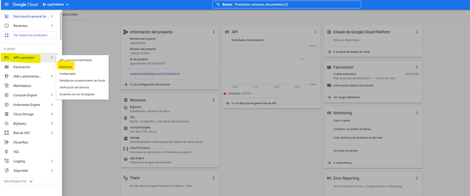 Haz clic en Biblioteca en el panel izquierdo del panel de control de Google Cloud Console.