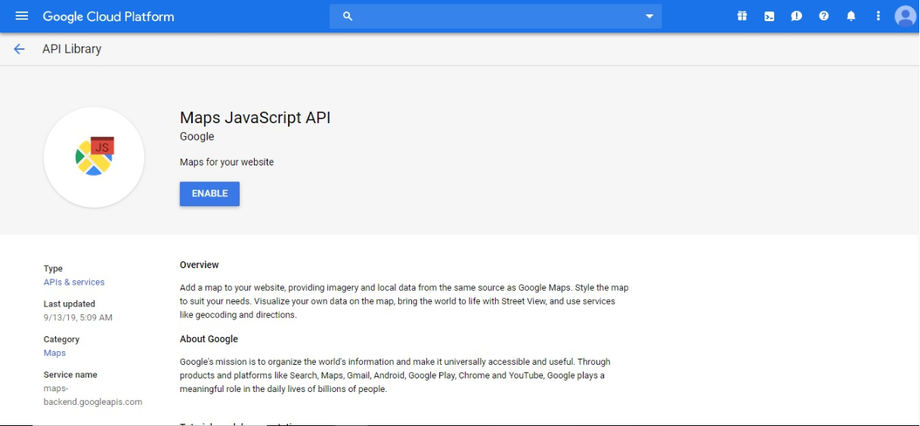 Busca Maps JavaScript API en Biblioteca desde el cuadro de búsqueda proporcionado.