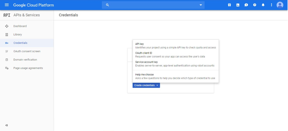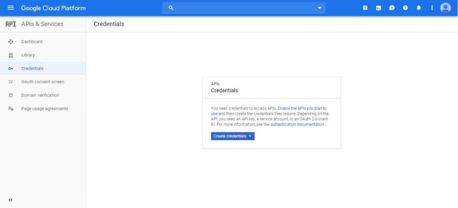 Una vez habilitado, haz clic en las credenciales en el panel de menú izquierdo de la consola de Google Cloud Platform.