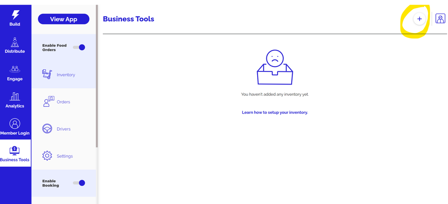 El Inventario es parte de la sección de Pedidos de Comida en Herramientas Comerciales. En el Inventario, puedes agregar elementos de productos que se mostrarán en el componente Pedidos de Comida en la página de la aplicación a la que los hayas agregado. Para agregar inventario, vete a tu panel de control y selecciona "Inventario/Inventory".