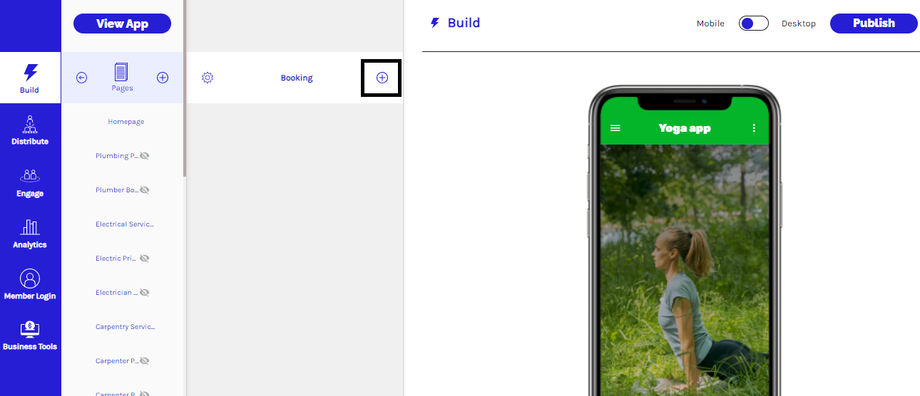 Una vez que hayas agregado o seleccionado la página en la que deseas agregar el componente de reserva, haz clic en el signo + junto al título de tu página para ver una lista de componentes.