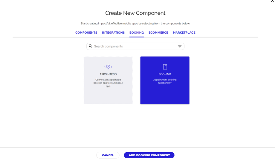 Se te mostrarán todos los componentes existentes disponibles para tu aplicación. Haz clic en la pestaña Reserva/Booking y seleccione el Componente de reserva, luego haz clic en el botón Agregar componente de reserva en la parte inferior de la página.