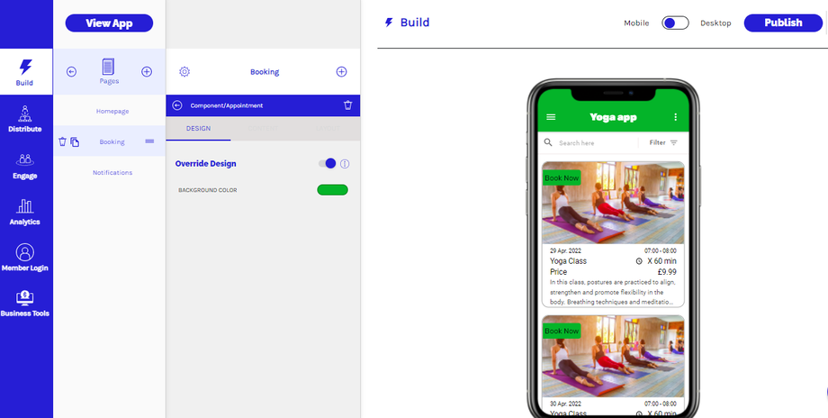 Puedes anular el diseño y cambiar el color de fondo del componente en la sección Diseño, como se muestra a continuación. Recuerda publicar tu aplicación desde tu Dashboard después de agregar el componente de reserva.