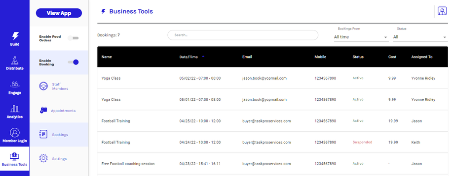 El administrador de la aplicación también puede acceder a todas las reservas desde la sección Panel de Control -> Business Tools -> Bookings.